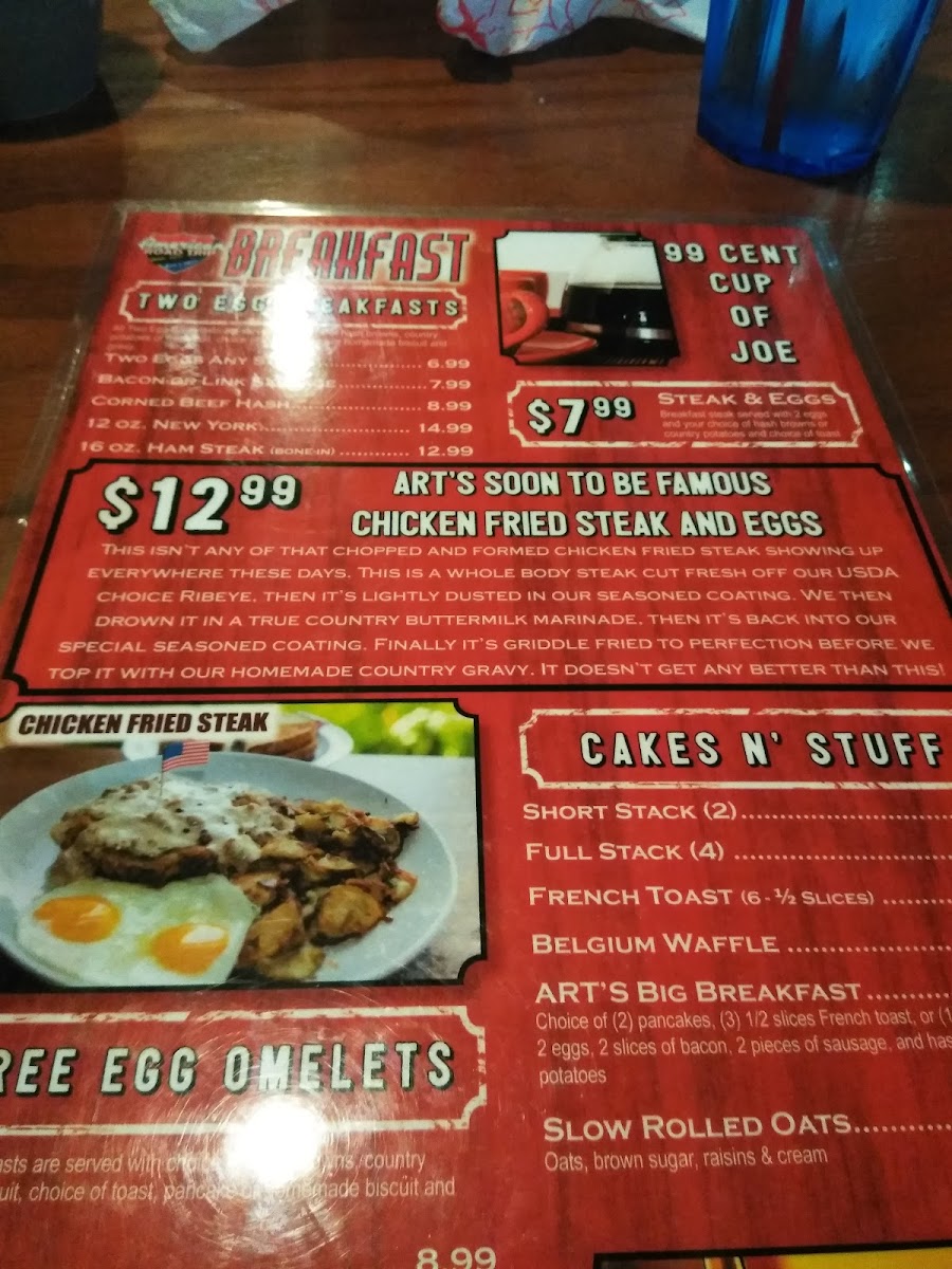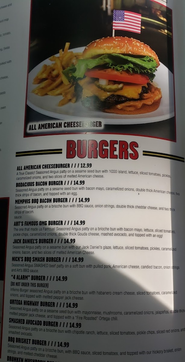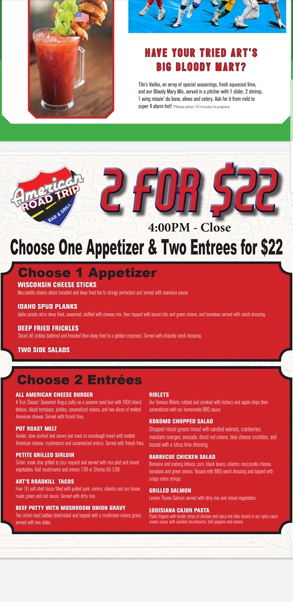 Cuisine Type: At American Road Trip, you’ll find a variety of mouthwatering American fare. The menu caters to all tastes with enticing options like ART’s Fish Tacos ($17.99) and Country Fried Steak ($20.99) that are sure to delight every palate. If you're in the mood for a true Southern experience, don't miss the New Orleans Jambalaya ($20.99), a hearty dish brimming with flavor. For seafood enthusiasts, the Mahi Mahi Creole ($23.99) and Art's Famous Shrimp Tacos ($17.99) are standout choices that are cooked to perfection.